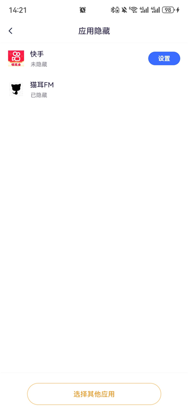 4、再点一次“隐藏应用”,就能看到刚加进去的软件,这时候可以点旁边的设置按钮调整权限或启动方式;