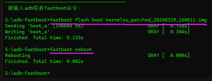 这时候回到电脑,打开adb-fastboot文件夹里的命令行窗口(比如双击运行CMD.bat),输入刷写命令:fastbootflashboot[你刚复制过来的镜像文件名]。记得把文件名替换成实际的那个,比如kernelsu_patched-12345.img。