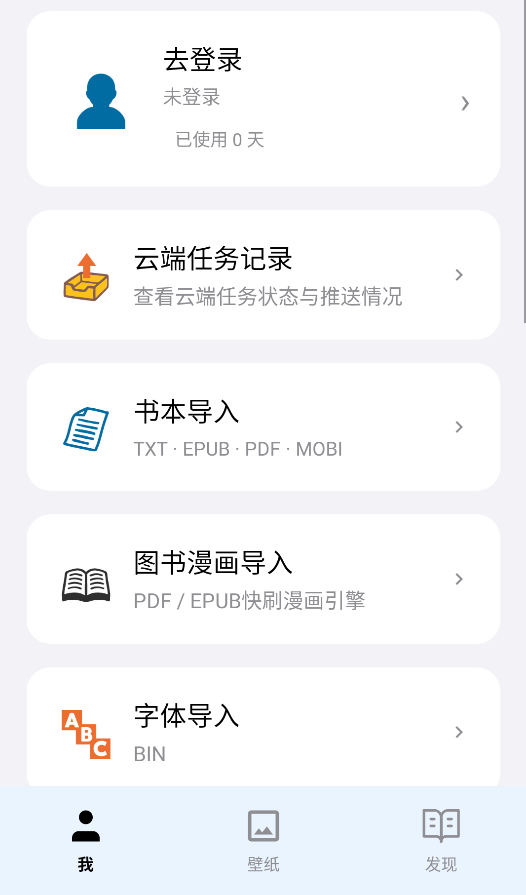4、注册完不用手动返回,App 会直接带你回到“我的”页面,这时候随便选一种导入方式,挑中你想看的文件,就能开始阅读了。