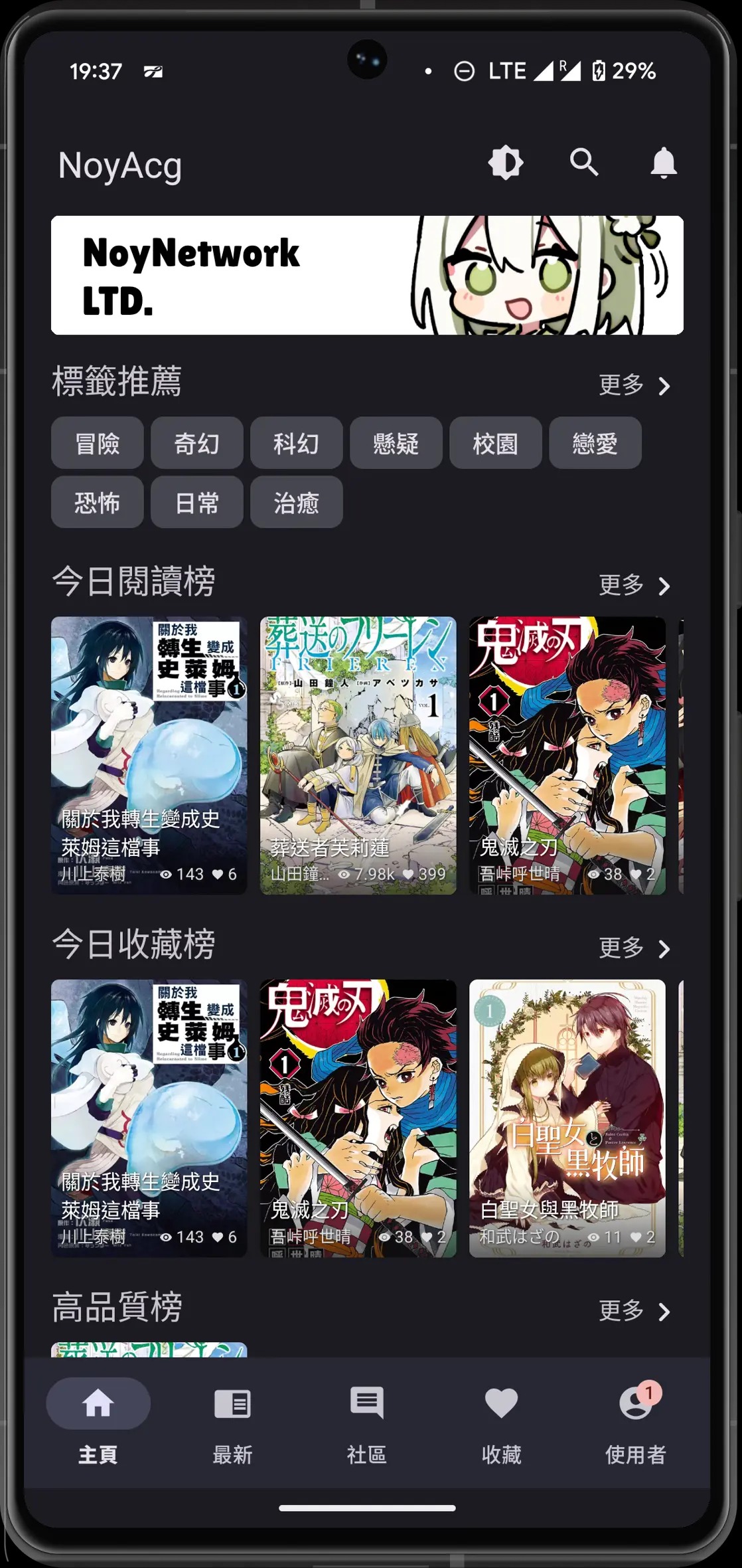 NoyAcg是一款面向二次元爱好者的漫画阅读平台,汇集了大量海内外热门与经典漫画作品,全部配有高质量中文翻译。画质清晰无水印,阅读过程中不会弹出任何广告干扰,还能一键缓存到本地,没网时也能随时翻看。连载更新节奏紧跟源头,基本不用苦等新章节。