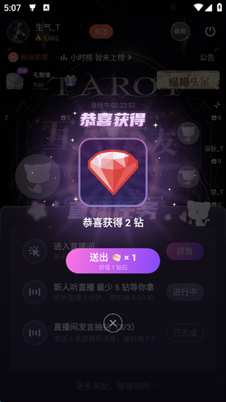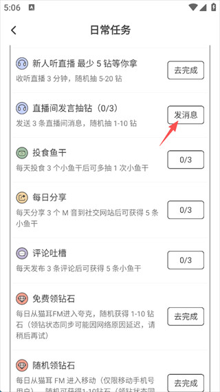 2、在任务列表里挑一个能做的,比如“在直播间发言抽钻石”,点它右边的“发消息”按钮。