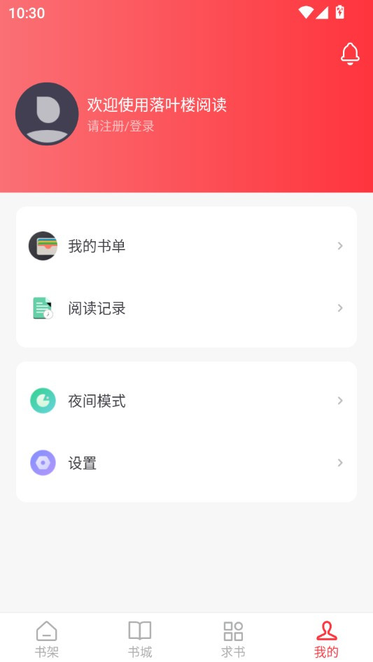 4、“我的”页面集中管理账户相关操作,首次使用需要注册,之后就能同步书架和阅读进度了。