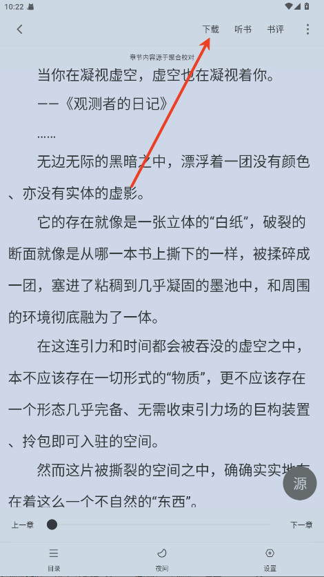 1. 打开追书大师,进入任意一本书的阅读页面,右上角有个下载图标,点它。