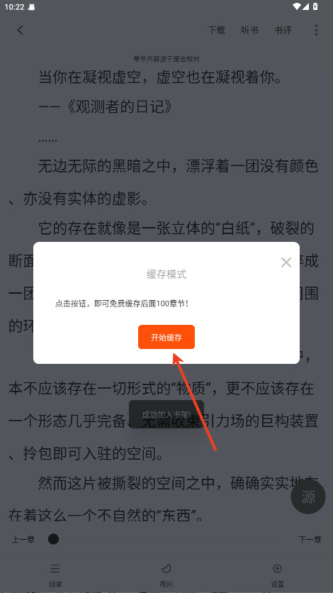 2. 弹出选项后,确认要缓存的章节范围,然后点“开始缓存”,等一会儿就存到手机里了。