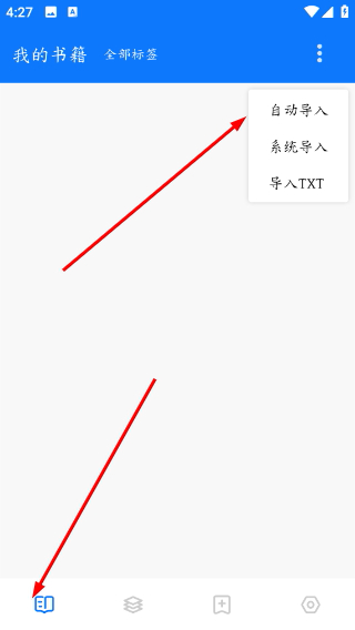 1、进入“我的书籍”页面,点击右上角三点菜单,选择“导入书籍”,底部还可切换不同功能栏(如本地文件、网盘等)。