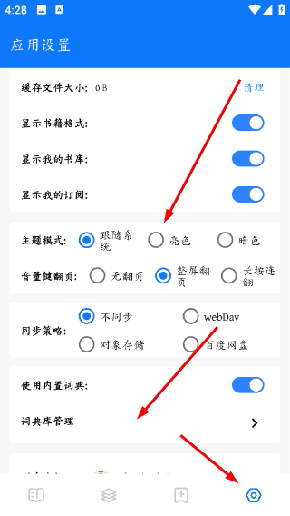 3、在“设置”中可自定义主题模式(日间/夜间/护眼)、翻页方式、字体等;点击“词典库管理”进入翻译与查词设置。