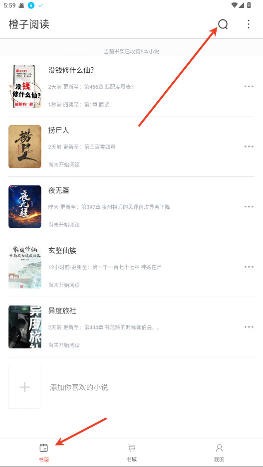 先在手机上打开橙子阅读,进到书架页面后,点右上角那个放大镜图标开始搜索