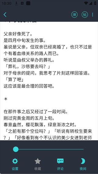 4、页面底部一排功能按钮很实用,比如调设置、加收藏、发评论,还有切换夜间模式