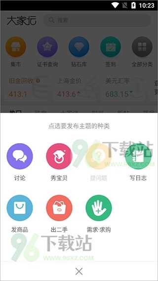 6、回到首页,你再点一下屏幕中间那个“+”号,就可以选择你要发啥啦,比如发个帖子、晒晒宝贝、写篇日志或者发布个商品都行。