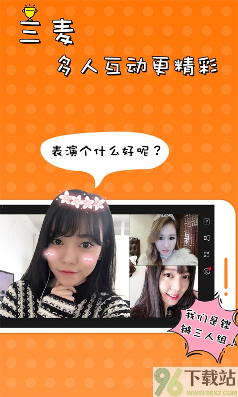 1、房间支持三人同屏连麦,这是它一个核心的玩法,比很多一对一的软件互动感更强。