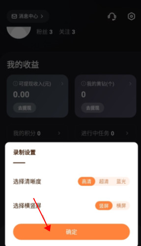3、根据需要选好清晰度和横竖屏方向,确认后就能直接开始录制了
