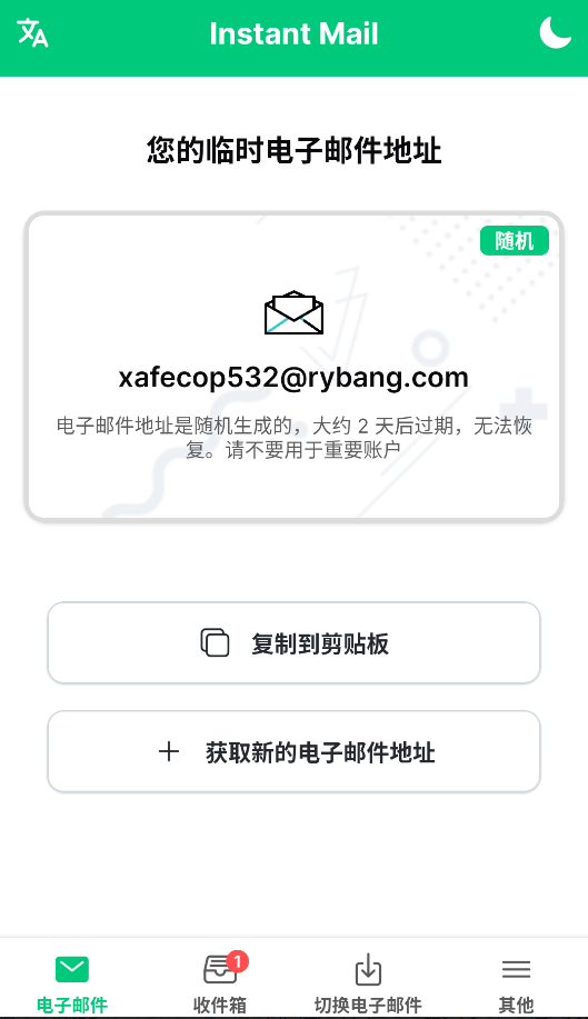 InstantMail这款应用主打的就是一个即开即用,省去了繁琐的账号注册流程。安装完成后直接打开,首页立马就能看到一个可以正常收件的临时邮箱地址,整个过程不需要填写任何个人信息。每个生成的邮箱地址有效期为三天,过期后点击按钮就能换一个新的,想用几次都行。不过要提醒一句,既然是临时性质的邮箱,涉及到重要账号注册或者关键信息接收的时候,还是建议用正式邮箱比较稳妥。