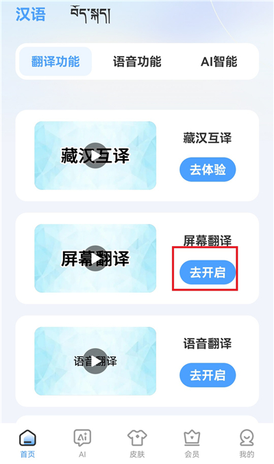 1、打开App首页,找到【屏幕翻译】并点进去,再点【去开启】。