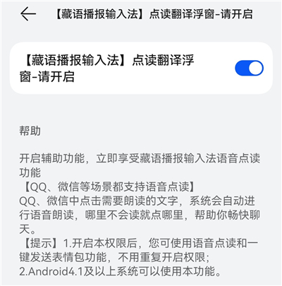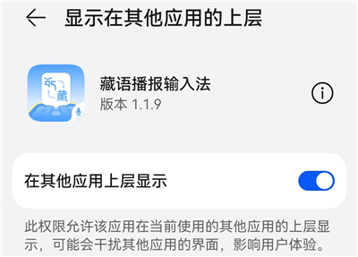 2、把滑块开关打开,允许藏语播报输入法在其他应用的上层显示。