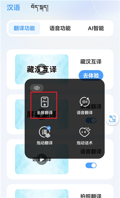 5、点选【全屏翻译】,就能把当前屏幕上的中文一次性翻成藏文。