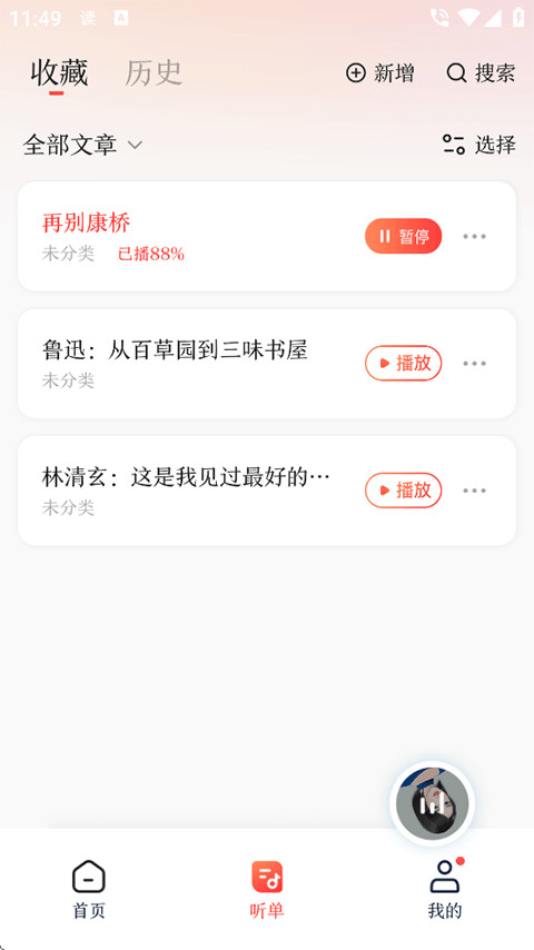 4、点进“听单”页面,之前听过的内容和收藏的文章都会自动归档,回头找起来特别方便。
