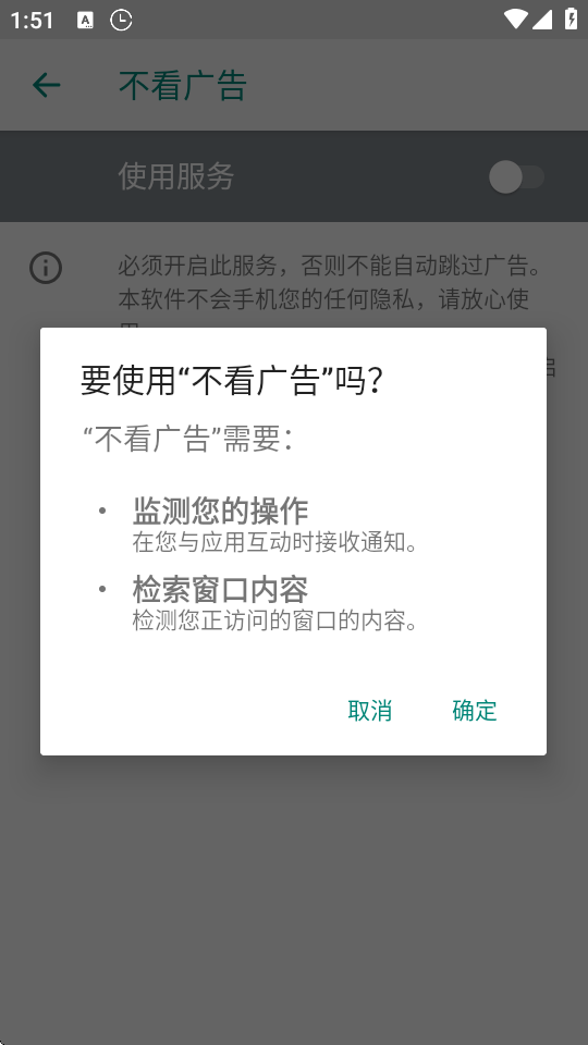 2、接着会提示你去开启辅助功能权限,点进去找到“不看广告”,把它打开。