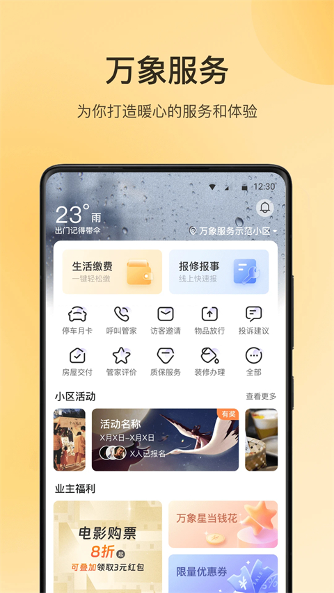 朝昔app又名万象服务,它是专为小区业主设计的一款智能物业服务平台。通过它,你可以随时缴纳水电燃气费、快速提交家里需要维修的问题、给物业提建议或反馈意见,还能用手机一键开门——从小区大门到自家楼栋,通行变得更省心。朝昔app的目标很简单:把琐碎的日常事务变得轻松一点,让住得舒服这件事,不再只是靠运气。