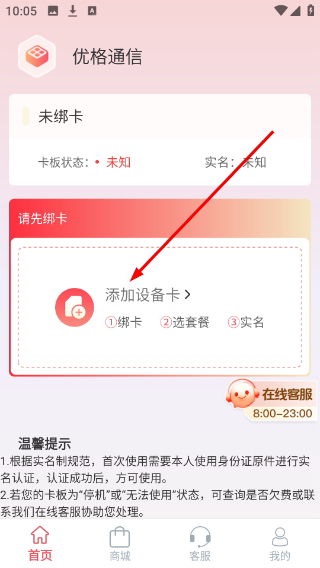 1、打开优格通信App,进入首页后点击“添加设备卡”,开始绑定流程;