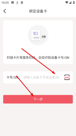 2、在绑定页面,你可以手动输入卡片的SN码,也可以点旁边的扫码图标,直接扫卡上的条形码自动识别;