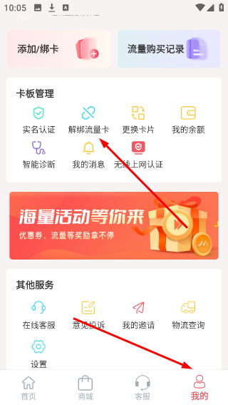 4、绑定完成后,点底部“我的”进入个人中心,就能进行解绑、实名认证、卡片管理等操作了。