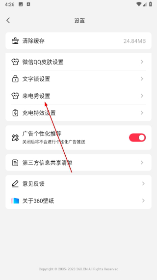 2、在设置菜单中,找到并点击“来电秀设置”选项;