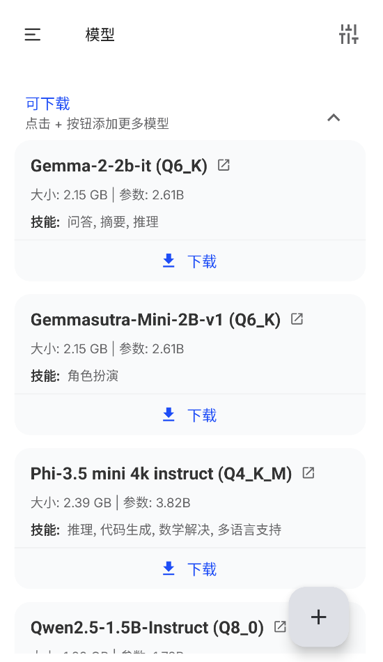 2、浏览可用模型列表,点击心仪模型下方的下载按钮等待安装完毕即可,如果想使用手机中已有的其他模型文件,可以点击右下角的加号进行手动导入