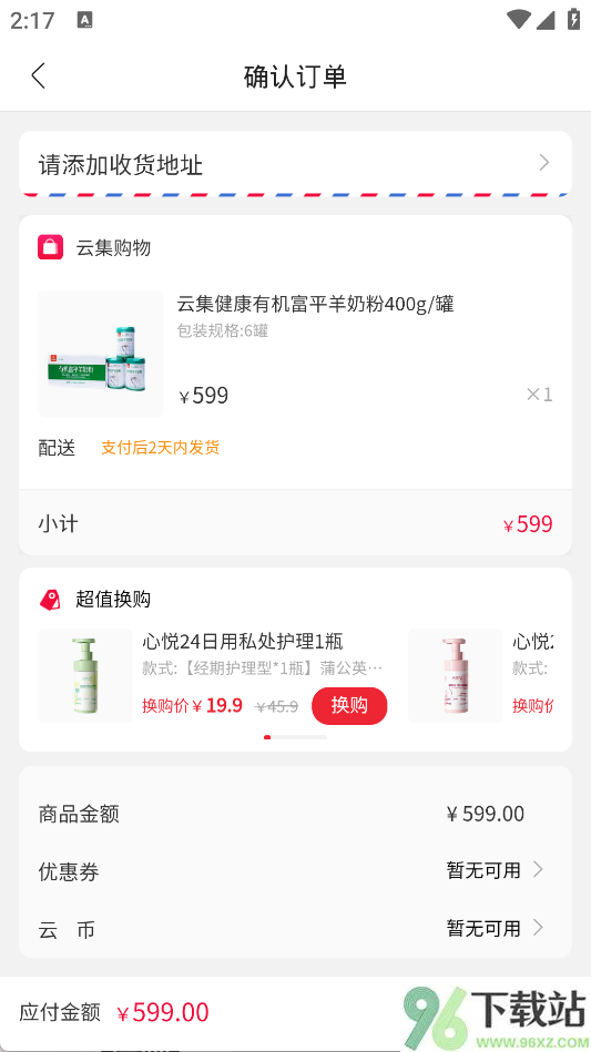 4、确认订单时,先选好收货地址,系统会自动列出商品明细和总价。这时候还能顺手参加【超值换购】,用很划算的价格加件小东西。核对无误后,点【提交订单】完成支付就行。