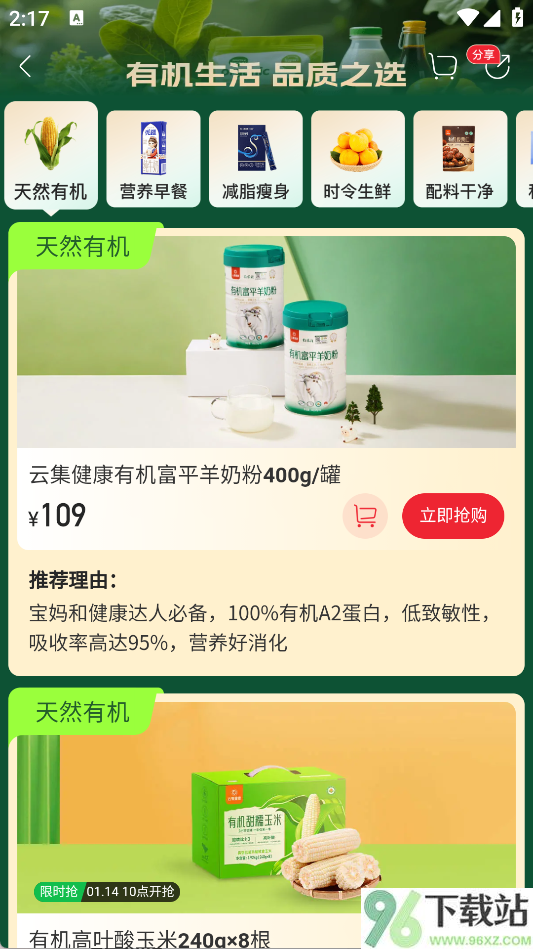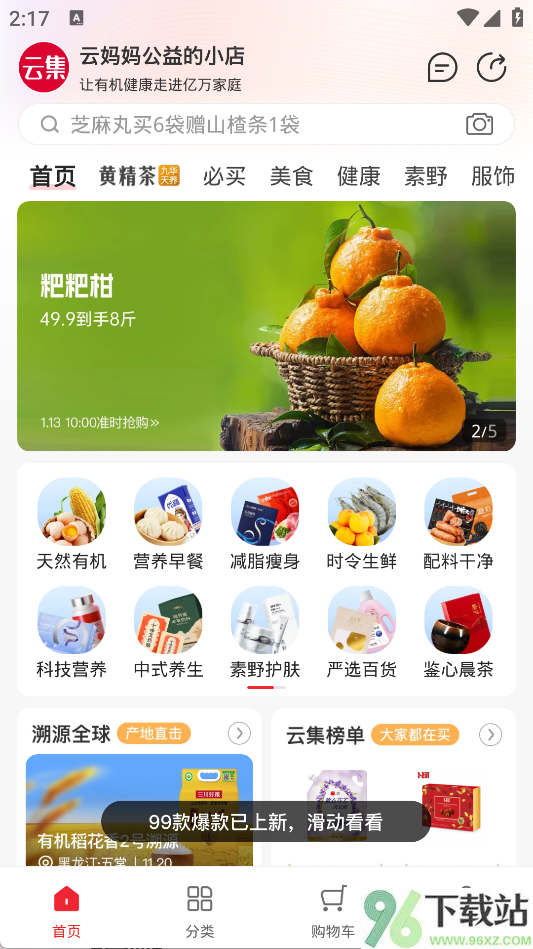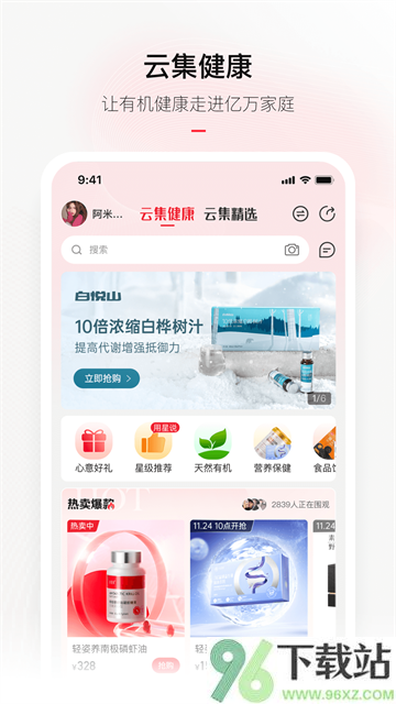 1、打开App首页,顶部的搜索框能快速找到你想买的东西;如果还没想好买啥,可以点“天然有机”“营养早餐”这类生活化标签逛一逛。首页还会轮播限时特惠和人气爆款,省去你到处比价的麻烦。