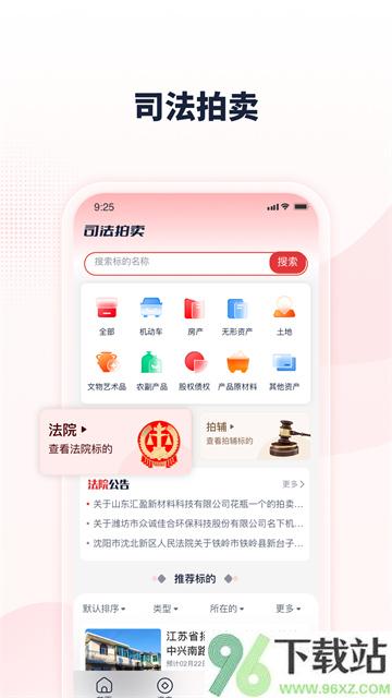 3、在【司法拍卖】页面,系统会滚动更新最新的法拍公告,支持关键词搜索,方便用户追踪特定标的物;