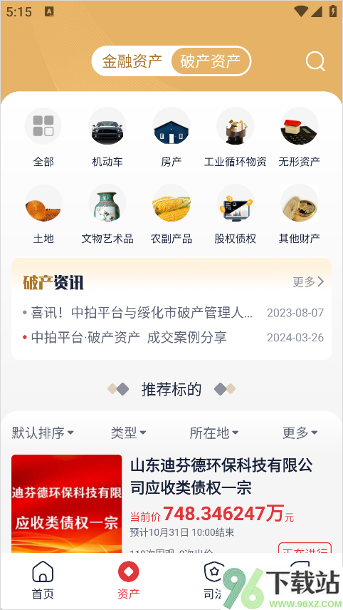 2、点进【资产】栏目,能看到金融类和破产类两大核心板块,还能按资产类型、地区、状态等条件进一步筛选,快速锁定目标;