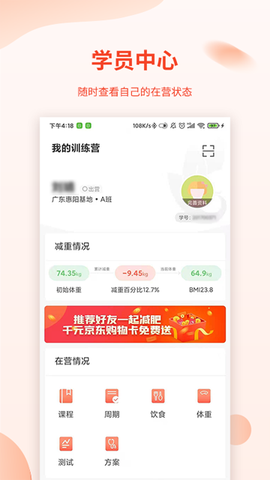 2、登录成功后进入学员中心,绑定个人信息和当前体重,系统会自动为你生成初步的饮食与运动安排。