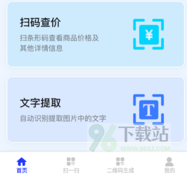 3. 主页就是大大的扫描框,对准目标直接扫,其他功能像生成码、查价、文字提取也都摆在显眼位置,点开即用。