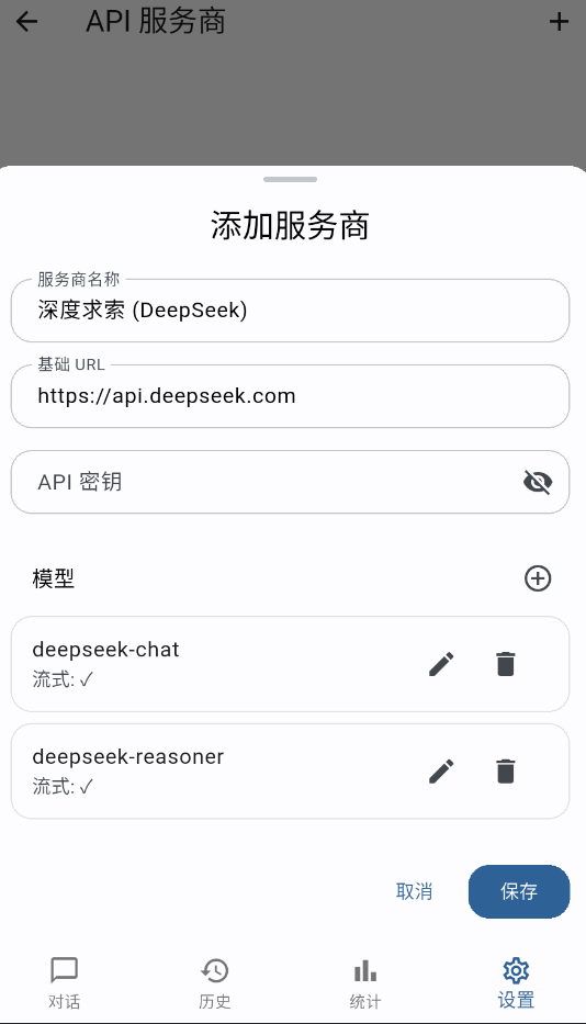 将你的API密钥填入输入框,完成后点击保存即可生效。