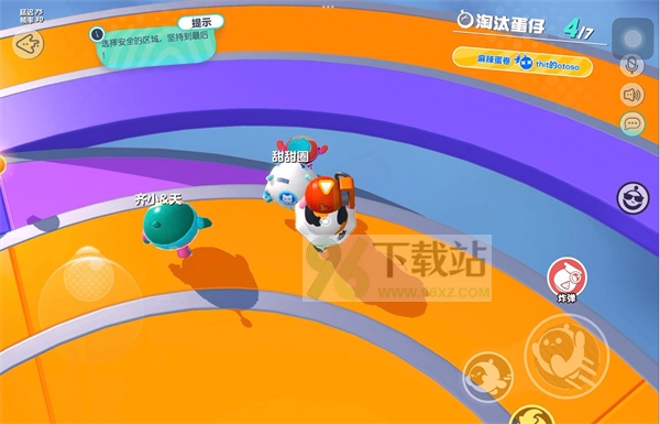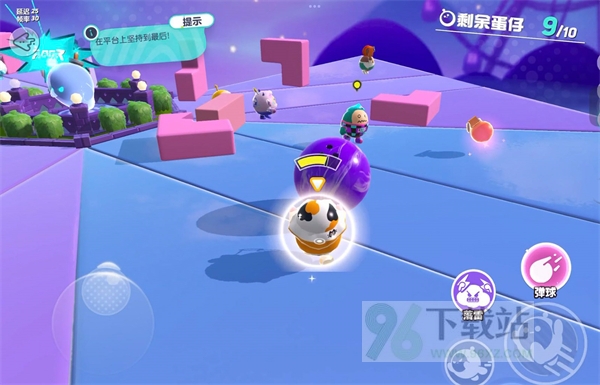 蓝紫大圆盘上,环形区域会突然变黄并翻转。记住:见黄就跑!同时警惕对手用落雷或撞击把你逼入险境。站位要灵活,别贪图中心安全区。