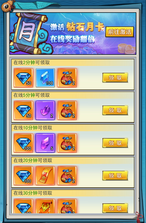 每天在线达到指定时长,就能在礼包里领到钻石,挂机的时候顺便完成。