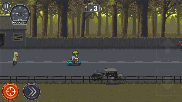 6、右边是攻击键,点一下就能扫射周围围上来的丧尸,但别光顾着打,前面突然冒出的路障或深坑一样能要命。