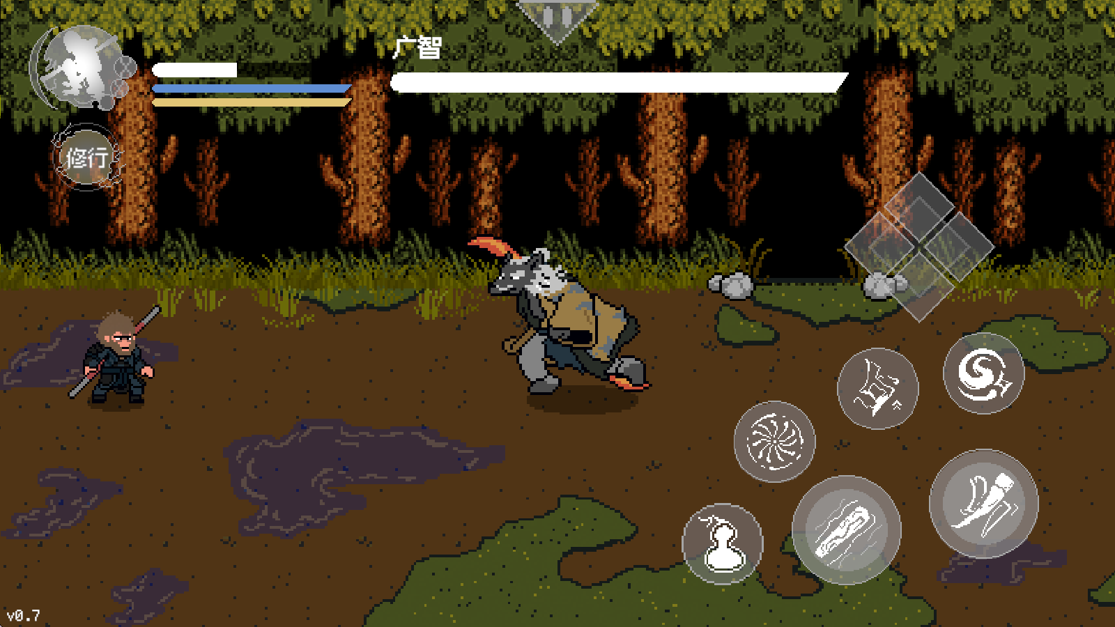 画面层次感明显提升,远景山峦、近景草叶分得清清楚楚,角色毛发和金箍棒的纹理也更细腻,像素风但不粗糙。手机党最关心的性能问题也优化了——显存占用降了,帧率稳了,中低端机打大圣残躯也不再卡成PPT。操作上,蓄力劈棍的前摇缩短了一点,配合新技能连招更丝滑。