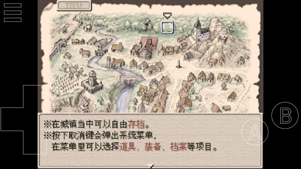 4、在城镇里按B键可以呼出菜单,里面能存档、调整队伍或者查看物品。