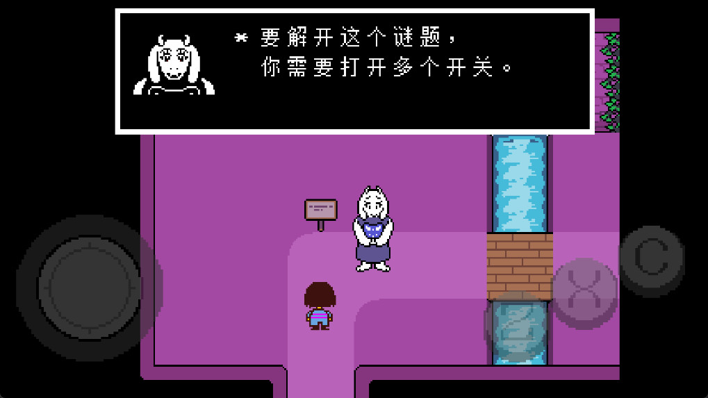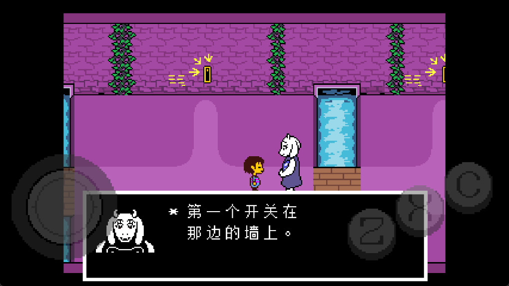 6、接下来是一条东西走向的走廊,两边有小溪。Toriel让你去拉墙上两个带标记的拉杆,拉完之后东边那些尖刺就收起来了,路就通了。