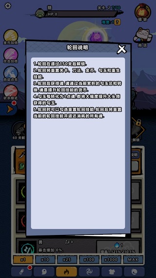 轮回则要等到150关才开放,虽然也保留宠物和图鉴,但——勾玉会被清空!这点特别坑,尤其前期辛辛苦苦攒的资源瞬间归零。不过别急着否定它,轮回后期非常关键,尤其是第一项加成能提升勾玉获取速度。建议手里至少攒够20个魂再考虑轮回,之后可以按100、1000这样分阶段推进,稳扎稳打更安心。