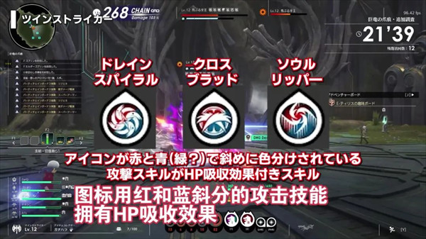 关于吸血技能,除了鼠标右键释放的专属动作之外,技能图标显示红蓝两色的攻击技能也附带吸血效果,另外还有一个增益技能,激活期间所有攻击都能回复生命值。