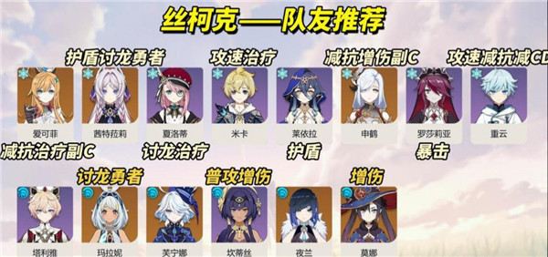 水冰队友能给丝柯克提供普攻和大招的独立增伤,收益最高。没满命副C的话,建议全队走水冰体系。