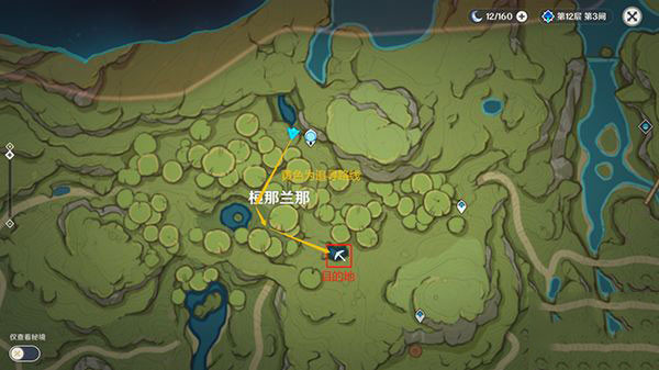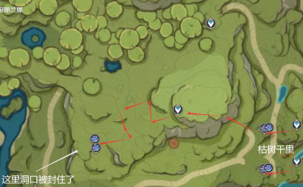 6、恒那兰那右侧区域,路线看着弯弯绕绕是因为有个山洞,进去看到仙灵跟着走就行: