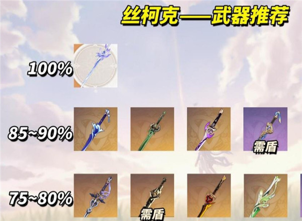 武器方面,专武苍耀肯定是最好的,其次是波乱月白经津、磐岩结绿、雾切之回光,厄水之祸得配合护盾用,排名在80%到85%这个梯队,再往后是赦罪、斫峰之刃、有乐御簾切、裁叶萃光、黑剑这些。