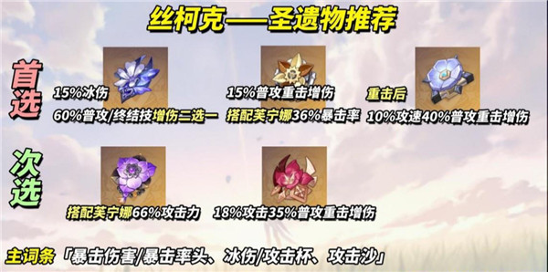 主词条暴击伤害或暴击率头、冰伤或攻击杯、攻击沙,副词条盯着双暴和攻击力看。配了芙宁娜的话,攻击杯和冰伤杯差距不大,没芙宁娜就优先冰伤杯。