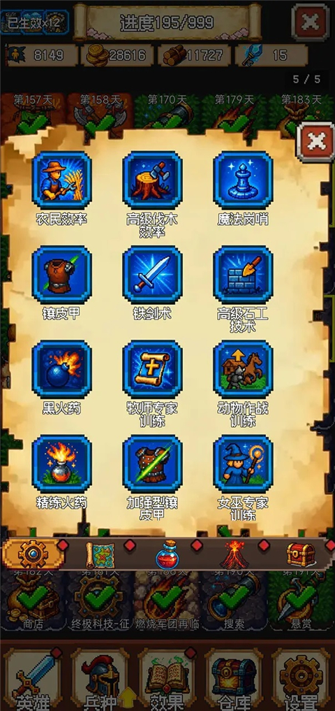 建造与科技需消耗金币、木材,建筑常有前置依赖,科技多设有人口门槛;