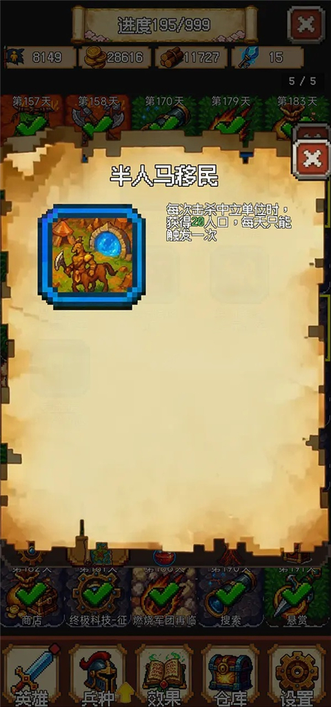 前期携带5个中甲或重甲肉盾兵种,稳扎稳打熬到第30天,开启神器获取循环;