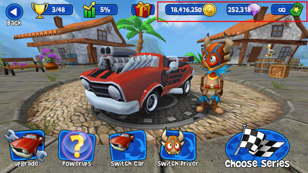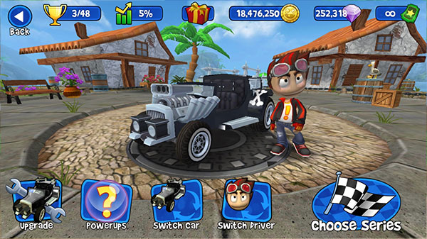 2、主界面底下四个按钮:修车(升级性能)、无敌(短暂免疫伤害)、选车、选人。先挑个顺眼的角色和车子,再点“Choose Series”选关卡;