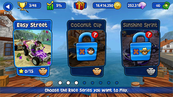 3、新手建议从“Easy Street”开始,难度低,赛道宽,适合熟悉操作和道具机制;